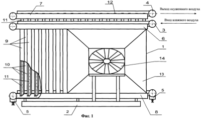 Установка для подготовки сжатого воздуха состоит из модульных осушителей 1, смонтированных на едином основании 2. Модульные осушители 1 объединены в батарею распредкамерами перетока 3, 4 с патрубками подачи и отвода воздуха и конденсатосборником 5. Каждый осушительный модуль 1 включает подающий коллектор-влагоотделитель 6, собирающий коллектор-влагоотделитель 7 и разделительный коллектор-влагоотделитель 8, которые связаны между собой системой теплообменных элементов 9 типа “труба в трубе”. Коллекторы-влагоотделители 6, 7, 8 выполнены в виде горизонтально расположенных трубопроводов, нижний из которых разделительный коллектор 8, а верхний – собирающий коллектор 7. Теплообменные элементы 9, подсоединенные к подающему коллектору 6, расположены вертикально и введены концами наружных и внутренних труб 10, 11 соответственно в разделительный коллектор 8, который связан внутренними трубами 11 с собирающим коллектором 7. Функционально внутренняя полость коллекторов 6 и 7 соответствует камерам входа и выхода потока влажного и осушенного воздуха. Введенные в разделительный коллектор 8 концы наружных труб 10 выполнены со скосом, как и концы внутренних труб 11. Модульные осушители 1 смонтированы на основании 2 так, что их системы теплообменных элементов 9 расположены относительно друг друга в шахматном порядке. Для очистки труб 10 собирающие коллекторы 7 осушителей 1 снабжены отверстиями, в которых установлены заглушки 12. Установка оснащена кожухом 13, защищающим теплообменные элементы 9. В проеме защитного кожуха 13 для охлаждения сжатого воздуха установлен вентилятор 14, обеспечивающий обдув поверхностей наружных труб 10.