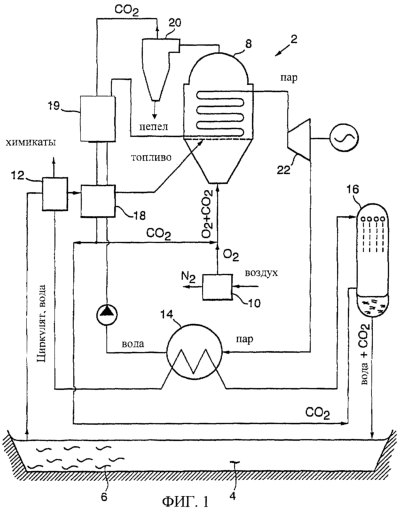 На фиг.1 показана электростанция замкнутого цикла 2 для преобразования солнечной энергии, накопленной путем фотосинтеза, в электрическую. Станция прежде всего состоит из бассейна с водой 4 для выращивания в нем макроводорослей 6 и из камеры сгорания 8 для сжигания частично высушенных водорослей с содержанием воды до 60%, причем сгорание происходит при искусственной атмосфере кислорода и углекислого газа.