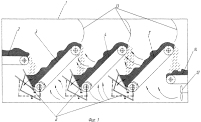 Зеленая растительная масса поступает в корпус 1 и с подающего конвейера 2 под действием гравитационных сил оседает на пластину 9, совершающей возвратно-поступательные движения под действием вибрирующего устройства 8, рычажной механизм которого приводится в действие от кривошипа 11, расположенного на нижнем валу конвейера 3. Вибрационное устройство 8 посредством пластины 9 подает растительную массу частями на наклонный конвейер 3, при этом перетряхивая и перемешивая ее. Затем зеленая масса захватывается конвейером 3 и транспортируется к следующему конвейеру 4 с одновременной продувкой агентом сушки сквозь воздухораспределительную решетку 7. Пройдя конвейер 3, частично подсушенная масса сбрасывается с него на вибрационное устройство 8 конвейера 4, при этом подвергаясь процессам ворошения и продувки агентом сушки от вентилятора 12. Далее на конвейерах 4 и 5 процессы повторяются. После конвейера 5 окончательно просушенная зеленая масса подается на конвейер 14 и транспортируется для дальнейшего использования. Фартуки 13 выравнивают слой высушиваемой массы перед сходом с очередного конвейера и способствуют направленному движению потока воздуха через воздухораспределительные решетки с растительным материалом по длине корпуса.
