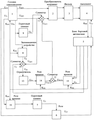 Устройство содержит: 1 – телевизионную головку самонаведения, включающую в себя телевизионную камеру на трехосном гиростабилизаторе и блоки формирования сигналов рассогласования; 2 – преобразователь координат; 3 – фильтры низких частот; 4 – автопилот; 5 – блок бортовой автоматики с источниками питания; 6 – нормально-замкнутое реле; 7 – пороговый элемент; 8 – запоминающее устройство; 9 – пороговый элемент; 10, 11, 12 – сумматоры; 13 – ограничитель сигнала; 14 – нормально-разомкнутое реле времени; 15 – переключающее реле времени; 16 – нормально разомкнутое реле времени.