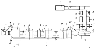 Воздуходувка 1 соединяется трубопроводом 14 с устройством задания расходов 3, которое включает в себя несколько параллельных вертикальных магистралей 15, в которые встроены регулируемые дозаторы расхода 16 (дроссели), запорная арматура 17 (краны) и указатели стабильности расхода 18 (ротаметры). Кроме того, установка содержит датчик температуры 19 (термометр), датчик давления 20 (микроманометр), запорную арматуру 21 (краны) и регулирующую арматуру 22 (дроссель). В качестве эталонного средства измерений используется индивидуально отградуированный счетчик газа 12.