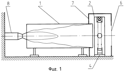 Стенд содержит газовод 1, на выходе из которого на раме 2 установлен источник излучения 3 и диаметрально противоположно ему – основной приемник излучения 4. В той же плоскости установлен дополнительный приемник излучения 5. Дополнительный приемник 5 установлен под углом 90° к основному, т.к. в этом случае в поле зрения его попадает минимальная зона исследуемого газового потока, освещенная источником излучения. Рама 2 с источником излучения 3 и приемниками 4 и 5 заключены в кабину 6 с внутренним светопоглощающим покрытием 7. Перед газоводом 1 на оси его закреплен источник исследуемого газового потока – ракетный двигатель 8.