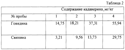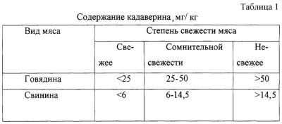 Способ оценки свежести мясного сырья, предусматривающий отбор пробы сырья, ее измельчение, экстракцию, центрифугирование, упаривание, хроматографическое разделение полученного экстракта путем прогона на тонкослойных силикагельных пластинах в хроматографических камерах, заполненных смесью ацетона и концентрированного аммиака в соотношении 18:3, окрашивание, определение концентрации биогенных аминов с помощью компьютерной программы Scion Image обработки данных тонкослойной хроматографии и отнесение определяемой концентрации к определенной степени свежести мясного сырья, исходя из установленных значений, при этом концентрацию биогенных аминов определяют, исходя из концентрации кадаверина как их представителя.