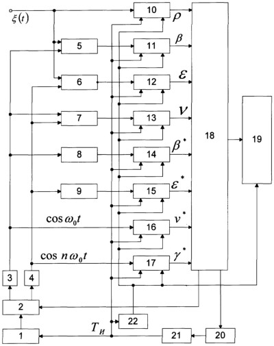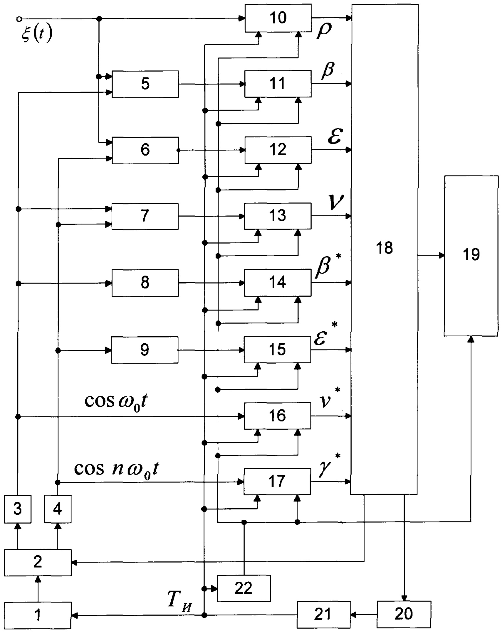 Момент начала измерения формируется формирователем импульсов пуска 20, работающего в ручном или автоматическом (под управлением вычислительного блока 18) режимах. Времязадающим элементом 21 формируется импульс, равный по длительности времени измерения Ти, который подают на управляющий вход тактового генератора 1, на первые управляющие входы интеграторов 10, 11, 12, 13, 14, 15, 16 и 17 и на вход формирователя импульсов остановки 22. В течение времени Ти тактовым генератором 1 осуществляется выборка значений опорного сигнала, записанных в блоке памяти 2, которые в цифровом виде по двум выходам поступают на входы цифроаналоговых преобразователей 3 и 4, на выходах которых и формируются аналоговые сигналы, являющиеся косинусной составляющей опорного сигнала с экстремумом в середине измерительного интервала и косинусной составляющей n-й гармоники опорного сигнала, поступающие затем на перемножители 5, 6 и 7, квадраторы 8 и 9 и интеграторы 16 и 17. Сигналы, являющиеся результатом перемножения измеряемого сигнала и косинусной составляющей опорного сигнала, измеряемого сигнала и косинусной составляющей n-ой гармоники опорного сигнала, возведения в квадрат косинусной составляющей опорного сигнала и косинусной составляющей n-ой гармоники опорного сигнала, а также косинусная составляющая опорного сигнала, косинусная составляющая n-ой гармоники опорного сигнала и сам измеряемый сигнал интегрируются в течение времени Ти. После окончания интегрирования результаты запоминаются на время, равное длительности импульса с выхода формирователя импульсов остановки 22, поступающего на вторые управляющие входы интеграторов 10, 11, 12, 13, 14, 15, 16 и 17 и индикатор 19. Сигналы с выходов интеграторов 10, 11, 12, 13, 14, 15, 16 и 17, которые в течение действия импульса на выходе формирователя импульсов остановки 22 постоянны во времени, подаются на соответствующие входы вычислительного блока 18, где происходит их перевод в цифровую форму и вычисление результата измерения по формуле (13). С выхода вычислительного блока 18 сигнал, являющийся результатом измерения, подается на индикатор 19, который фиксирует его и отображает до окончания следующего измерения. Вычислительный блок 18 может задавать момент начала следующего измерения для блока 20 и изменять содержимое блока памяти 2 в зависимости от требуемого количества выборок значений опорного сигнала и его n-й гармоники.