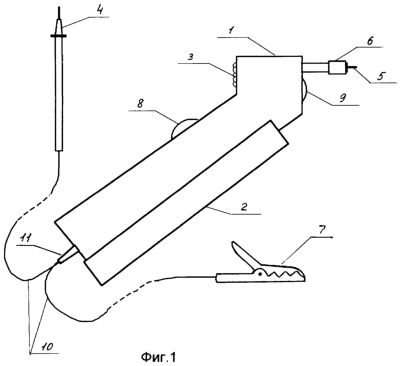 Прибор содержит корпус 1 в виде “пистолета” с крышкой 2 отсека питания. На задней части корпуса 1 вверху расположены индикаторные светодиоды 3. Для подключения к клемме напряжения фазы А счетчика в приборе имеется потенциальный щуп 4, а к клеммам фаз В и С – потенциальный щуп 5. Со щупом 5 конструктивно объединен датчик 6 тока. Для подключения прибора к нулевой клемме счетчика служит зажим 7 типа “крокодил”. Из прорези в корпусе 1 выступает проградуированный в градусах лимб 8 регулятора фазы, конструктивно объединенного с выключателем подсветки. В передней части корпуса 1 под щупом 5 и токовым датчиком 6 расположена линза 9 подсветки. Щуп 4 и зажим 7 соединяются с электронной схемой прибора с помощью гибких проводников 10, пропущенных у основания корпуса 1 сквозь резиновый чулок 11. Внутри корпуса 1 расположены элементы 12 питания подсветки, лампочка 13 подсветки и печатная плата 14 с электронными компонентами схемы.
