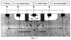 На фиг.3 дана схема включения напряжения, где на области контактов к базе и к подложке подается смещение базы U базы; на рабочие коллектора подключаются напряжения U коллектора 1 и U коллектора 2 от источника питания через две одинаковых нагрузки; на эмиттер задается потенциал U эмиттера для обеспечения разности потенциалов между базой и эмиттером, при которой протекает ток из базового контакта в эмиттер и создается поток носителей тока (условно показанный стрелками) одного знака, например, J дырок и возникает инжекция из эмиттера носителей тока другого знака и создается поток, например, J электронов, одна часть которого доходит до рабочих коллекторов, другая – до контактов к подложке, а большая часть инжектированных носителей рекомбинирует с носителями другого знака в кармане и в подложке.