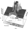 Особенность данного прибора в части распределения областей с наибольшей скоростью рекомбинации иллюстрируется приведенными на фиг.4 распределением скорости объемной рекомбинации в кармане и подложке недалеко от эмиттера при приложении магнитного поля и на фиг.5 условным распределением потоков носителей тока электронов и дырок без и с магнитным полем. Как видно на этих фигурах, интенсивная рекомбинация проходит по оси симметрии вдоль распространения инжектированного потока электронов. Поток электронов уменьшается по мере удаления от эмиттера за счет рекомбинации и растекания после выхода в подложку на потоки, идущие к рабочим коллекторам и контактам к подложке.