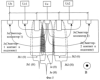 На фиг.1 показано поперечное сечение полупроводникового прибора, чувствительного к магнитному полю, где прибор состоит из монокристаллической подложки первого типа проводимости (1) с главной поверхностью (2) и обратной стороной (3); глубокого кармана (4), расположенного со стороны главной поверхности подложки и имеющего малую концентрацию примеси, создающей второй тип проводимости; областей контактов к базе (5) и (6), располагающихся в кармане, имеющих глубину не менее глубины кармана и имеющих сильное легирование второго типа проводимости; сильнолегированных областей первого типа проводимости с глубиной меньше глубина кармана, расположенных внутри кармана эмиттера (7), первого (8) и второго (9) рабочих коллекторов и расположенных вне кармана первого (10) и второго (11) контактов к подложке.