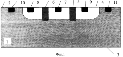 На фиг.2 представлена топология планарной структуры прибора, где прибор состоит из монокристаллической подложки (1); глубокого кармана (4), располагающегося в подложке со стороны главной поверхности (2); контактов к базе (5) и (6); располагающихся в кармане и имеющих длину не менее ширины кармана; эмиттерной области (7), располагающейся в кармане между контактами к базе и имеющей длину менее ширины кармана; первого (8) и второго (9) рабочих коллекторов, располагающихся в кармане между контактами к базе и краем кармана и имеющих длину менее ширины кармана; первого (10) и второго (11) контактов к подложке, располагающихся вне кармана.