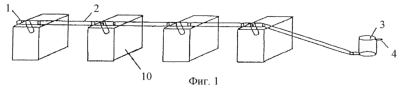 При работе в коммуникационном устройстве обычно применяются параллельно или последовательно соединенные аккумуляторные батареи, например, для коммуникационной системы, работающей на 48 В, потребуется 24 шт. батареи на 2 В или 4 шт. батареи на 12 В. В этом случае в данном примере осуществления указанных основных частей 10 батарей бывает несколько, на каждой основной части 10 батареи установлено по меньшей мере одно газосборное-выпускное устройство 1, на газопроводе 2 выполнено несколько входов газа, которые соединены с соответствующими выходами газа газосборного-выпускного устройства 1, установленного на каждой основной части 10 батареи.