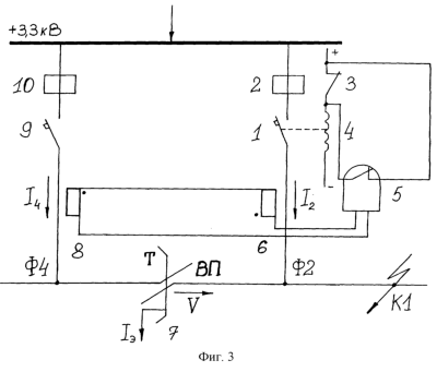 Предлагаемый способ может быть реализован на смежных фидерах тяговой сети постоянного тока, оборудованных как выключателями с индуктивными шунтами (типа АБ-2/4 или ВАБ-43), так и выключателями с РДШ (типа ВАБ-49). Ниже в качестве примера приведена схема устройства защиты по предлагаемому способу, выполненная применительно к смежным фидерам, оборудованным быстродействующими выключателями с защитным реле РДШ (фиг.3), где:
