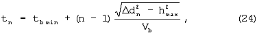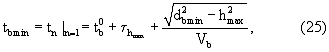 Примем, что время разгона подвижного объекта 2 до скорости Vb с началом горизонтального движения пренебрежимо мало. Если временем разгона пренебречь нельзя, то момент времени tb min сброса первых промежуточных станций 5 определяют из решения уравнения