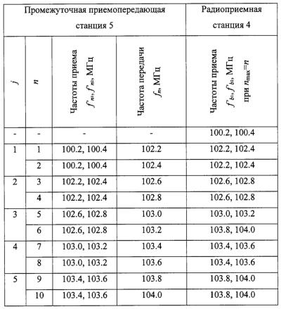 значения частот f’b приема радиоприемной станции 4 при сбросе очередных nmax промежуточных приемопередающих станций 5 с подвижного объекта 2, а также значения частот fn и f’n передачи и приема промежуточных приемопередающих станций 5 сведены в таблицу.