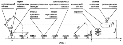 Конструкции промежуточных приемопередающих станций 5 разрабатывают с учетом ударных нагрузок, возникающих при столкновении с подстилающей поверхностью (см., например, В.Б. Карпушин. Вибрации и удары в радиоаппаратуре. – М.: Советское радио, 1971, с.155-216). В связи с этим вторые приемные антенны 40 и вторые передающие антенны 56 промежуточных приемопередающих станций 5 могут размещаться внутри ударопрочных радиопрозрачных корпусов, выполненных, например, из фторопласта.