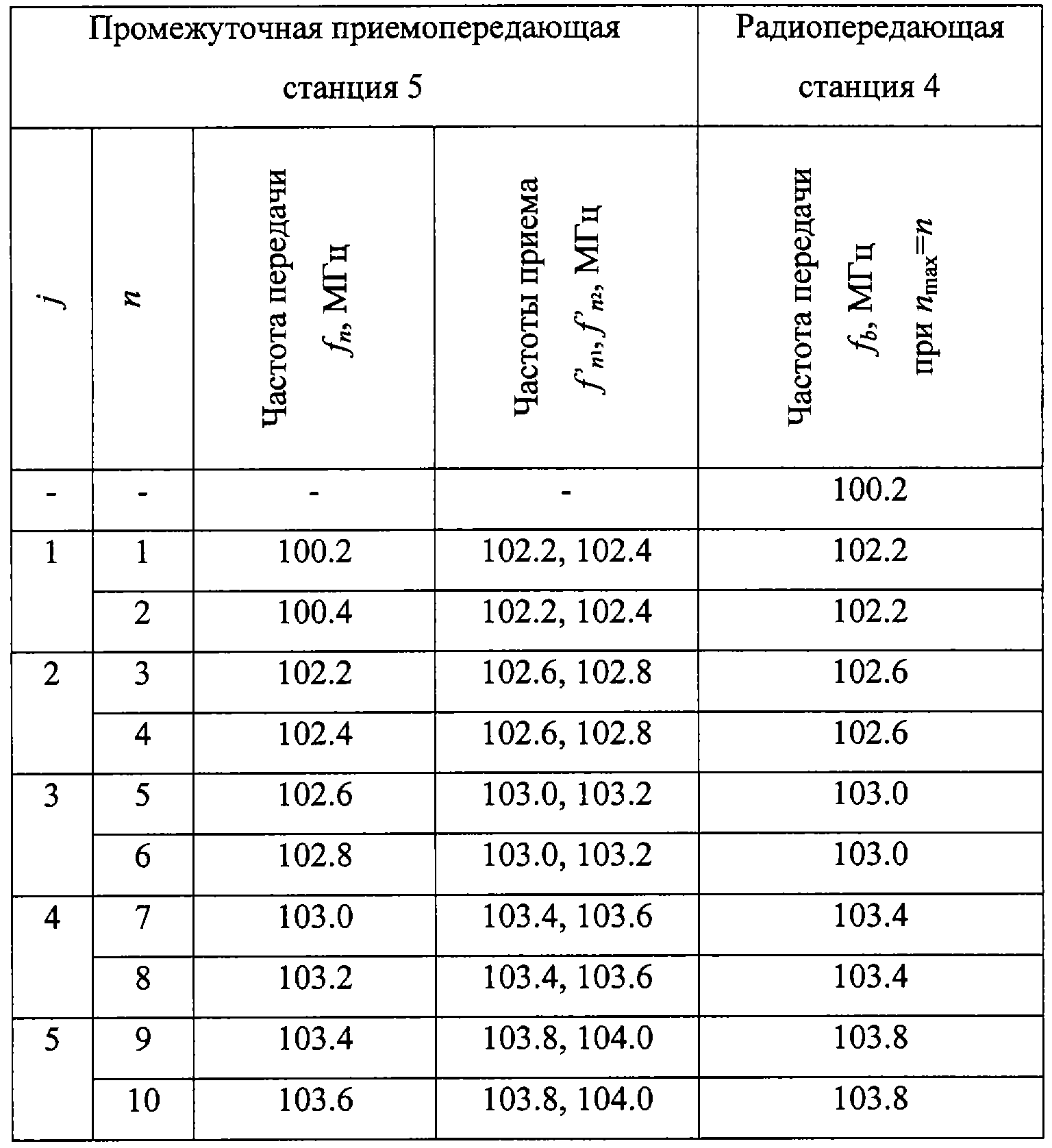 Частотами передачи радиопередающей станции 4 и промежуточных приемопередающих станций 5 являются заданные рабочие частоты радиосигналов, передаваемых соответственно с радиопередающей станции 4 и с промежуточных приемопередающих станций 5.