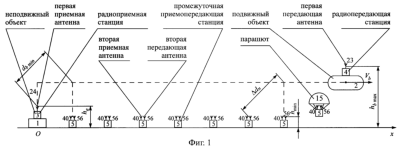 Радиоприемная станция 3 принимает радиосигналы, переданные с каждой из группы первых (n=1,2,…,Q) сброшенных с подвижного объекта 2 промежуточных приемопередающих станций 5. При этом работа блоков радиоприемной станции 3 протекает аналогично описанному выше, причем значение частоты колебаний, вырабатываемых первым гетеродином 28, равно значения рабочих частот радиосигналов, принимаемых на неподвижном объекте 1, равны