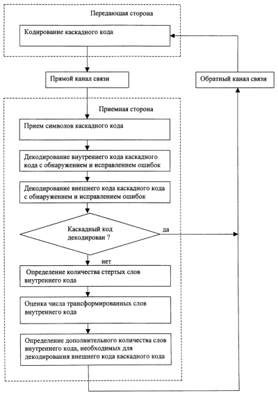 По каналу обратной связи информация о количестве дополнительных слов каскадного кода передается на передающую сторону. На передающей стороне по этому запросу требуемое число слов внутреннего кода передается на приемную сторону, и повторное декодирование каскадного кода осуществляется с учетом вновь принятых слов внутреннего кода.