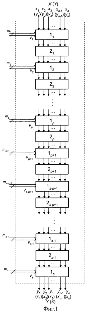 Заявленное устройство работает следующим образом. При подаче на вход n-разрядного двоичного вектора Х (прямое преобразование) последовательно в каждом из БУП 1 и затем в подключенном к нему БФП 2 над ним выполняют соответственно управляемую операционную подстановку и фиксированную перестановку. Значение соответствующих разрядов n-разрядного вектора на выходе конкретного (например, первого) БУП 11 определяется как структурой БУП (числом Z1 и типами УЭ 1.1), а также значениями соответствующих разрядов n-разрядного управляющего вектора. На n-разрядном выходе БФП 21 положение соответствующих разрядов преобразованного в БУП 11 n-разрядного вектора будет определяться выбранным вариантом коммутации входов и выходов БФП 21 (см. фиг.9). Число (т.е. число S) таких циклов преобразования выбирают с учетом предъявленных к устройству требований по криптостойкости и скорости преобразования. На выходе устройства значения разрядов (у1, у2,… yn) n-разрядного преобразованного двоичного вектора Y будут определяться совокупно проведенными над ним операциями управляемых операционных подстановок (в БУП 11-1s) и фиксированных перестановок (в БФП 21-2s-1) в зависимости от значений битов m-разрядных управляющих векторов на управляющих входах 11-1s.