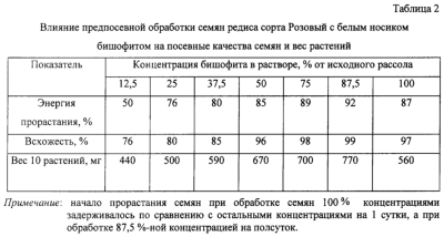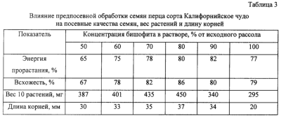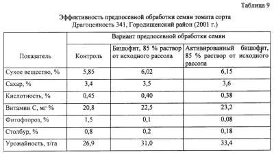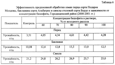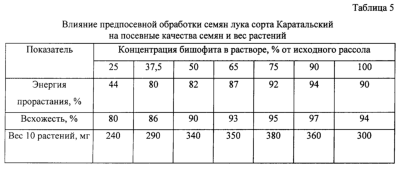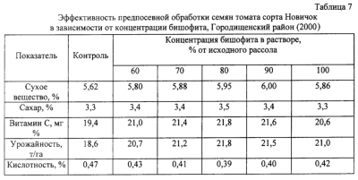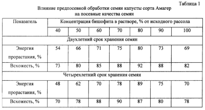 Изобретение предназначено для использования в области сельского хозяйства. Способ предпосевной обработки семян овощных культур включает воздействие на семена жидкой средой, содержащей стимулятор всхожести семян. В качестве стимулятора используют рассол природного минерала бишофит формулы MgCl2· 6Н2О. Воздействие рассолом на семена осуществляют в течение 2…8 ч при 30…45° С. Из состояния покоя семена выводят воздействием магнитного поля мощностью 200-400 Э при обработке их рассолом бишофита. Концентрация раствора – 15-100 мас.% минерала бишофита. Способ обработки семян позволит ускорить процесс прорастания, получить выровненные всходы и повысить урожайность. 12 табл.