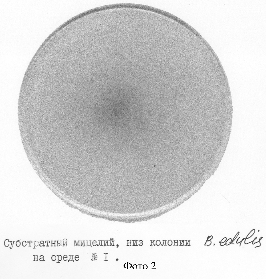 1. Способ выращивания мицелия Boletus edulis, предусматривающий высевание базидоспор белого гриба Boletus edulis на питательную среду, инкубирование их до образования первичного мицелия, отличающийся тем, что отбирают образованный первичный мицелий, вносят его в емкость с питательной средой и инкубируют в темноте при температуре 20-24°С до 30 дней с образованием на поверхности среды мицелия в виде слизистоволокнистой массы с плотной бесцветной пленкой, вниз от которой растет грибница в виде густой сети разветвленных гиф в условиях жидкой питательной среды или в виде плотного субстратного и войлочного воздушного мицелия на агаризованной питательной среде.