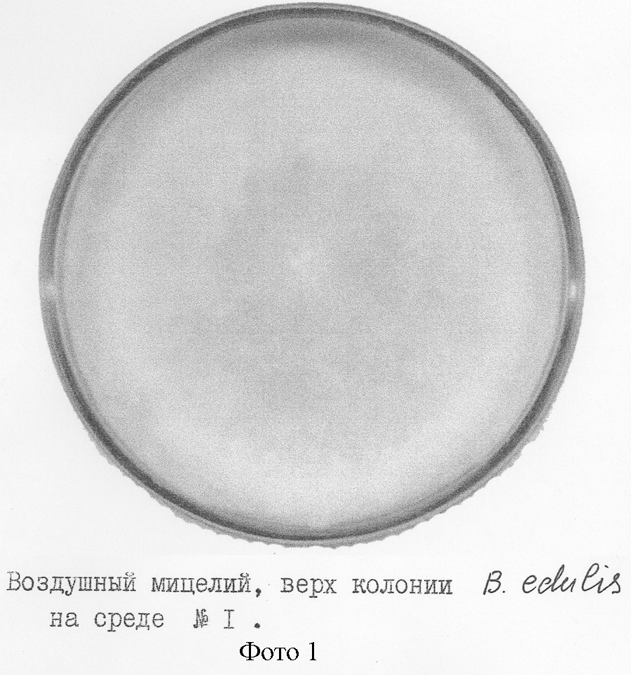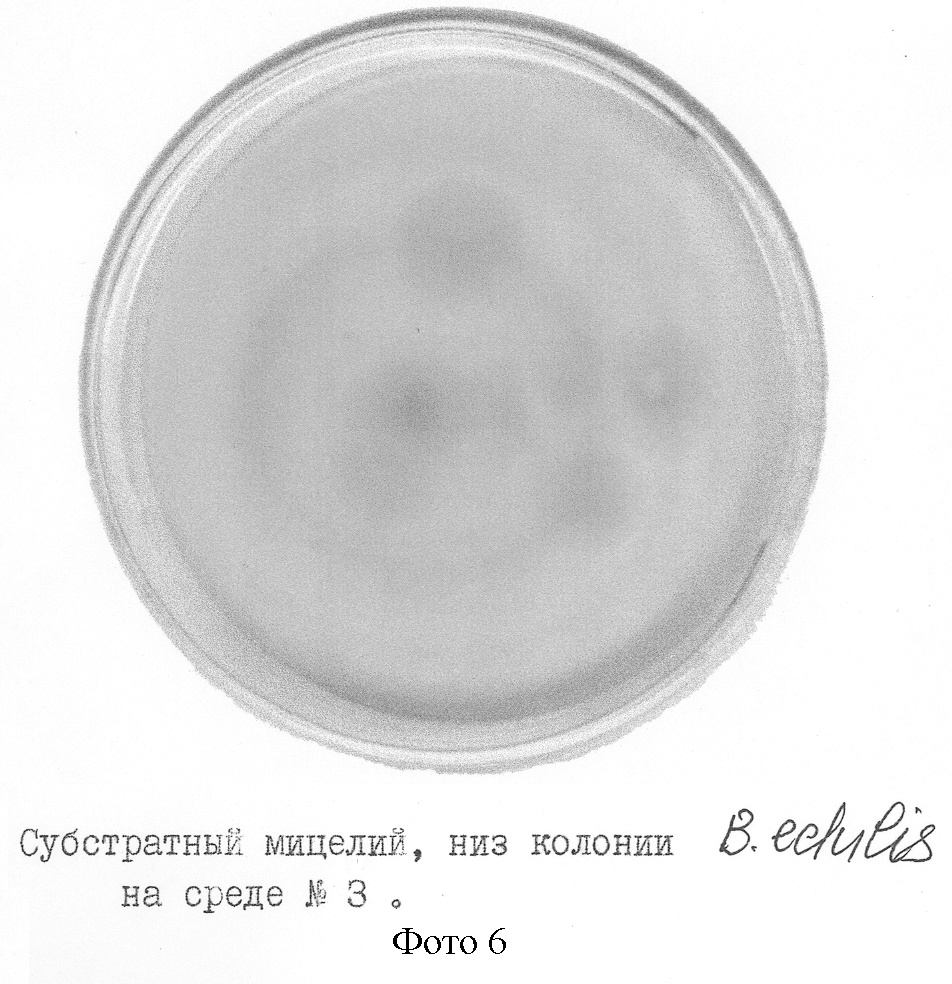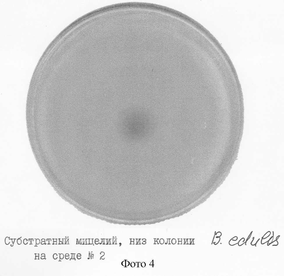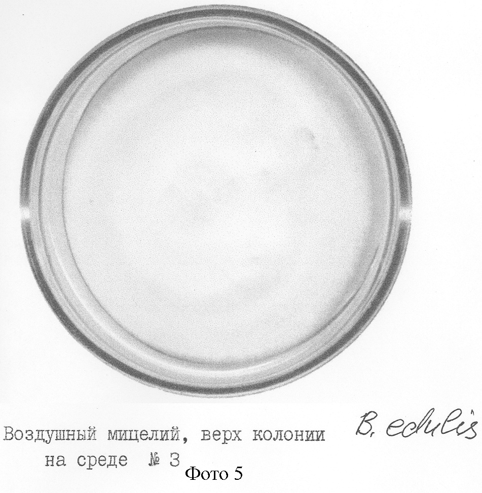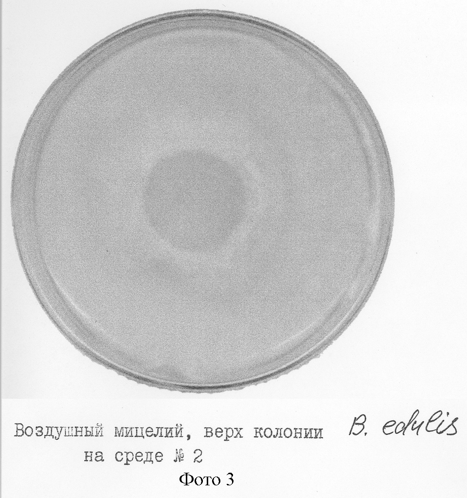 Пример 3. Посевной мицелий в виде кусочка первичного мицелия вносят в центр чашки Петри со средой, содержащей минеральные соли, сахара, аминокислоты, органические кислоты, в качестве источника биологически активных веществ органический комплекс животного происхождения – 1,5 мас.% пептона в дистиллированной воде, рН среды 4,5-5,0.